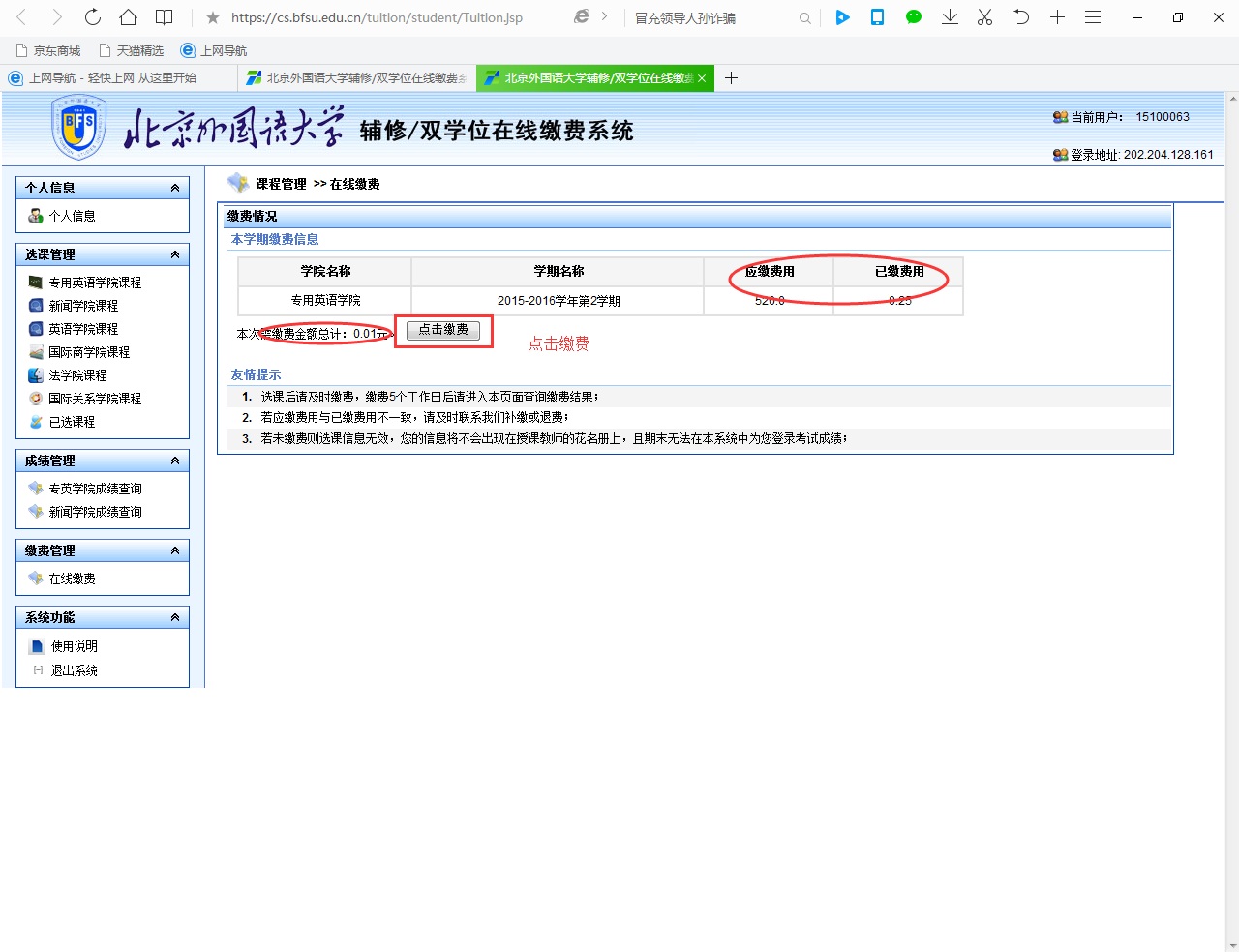 选课信息确认无误后,点击“在线缴费”,进入下图页面: