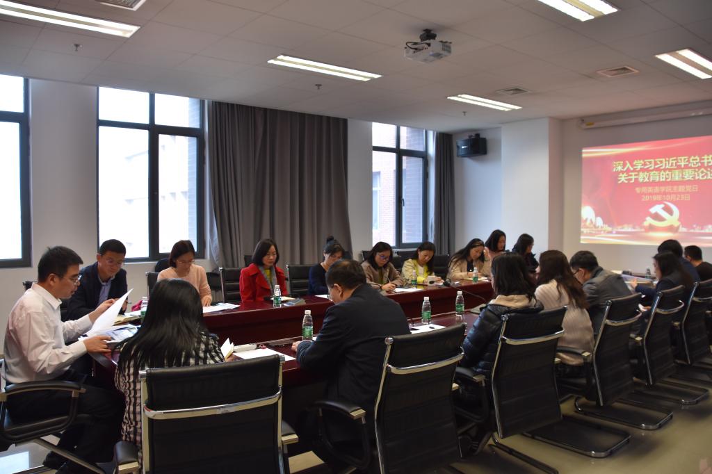 为深入贯彻落实学校“不忘初心、牢记使命”主题教育活动要求,pa集团官网入口直属党支部10月23日下午1:20在国际大厦1016会议室举行主题党日活动,召开“深入学习习近平总书记关于教育的重要论述”学习交流会。学校主题教育第三督导组督导、离退休党总支副书记刘刚、学院“双带头人”教师党支部书记工作室负责人李莉文、直属支部书记仵胜奇、副书记蔡鸿、支部委员蒋岳春、匡琳琳 以及全体党员19人参加。交流会由蔡鸿主持。